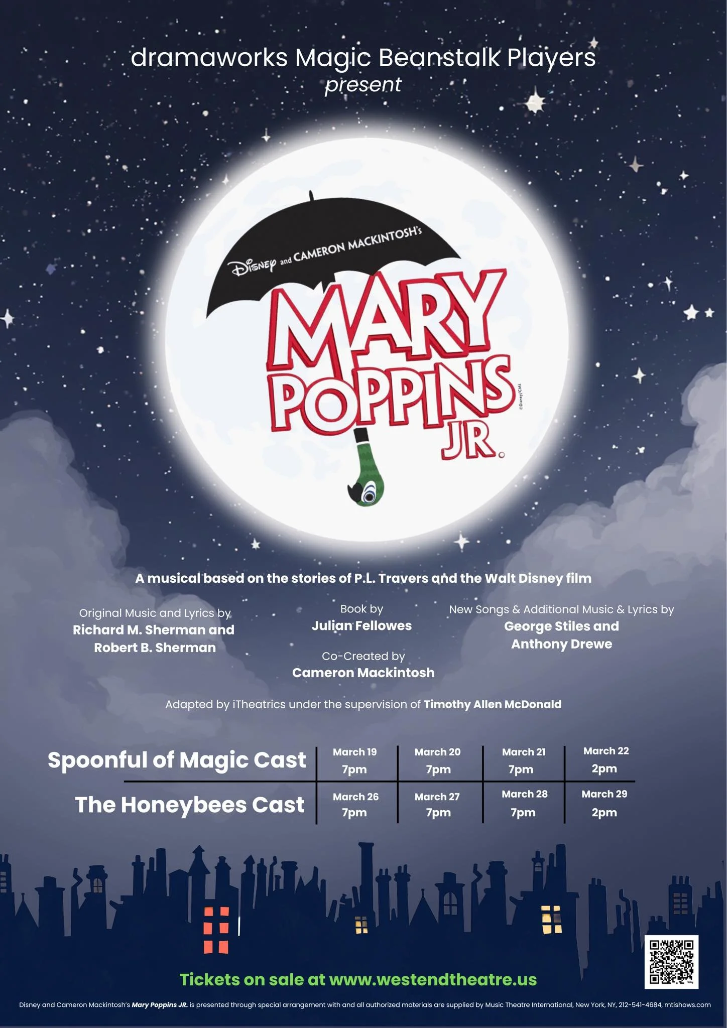 Synopsis: Based in London, the Banks household is in absolute shambles. Two mischievous children, one overwhelmed mother, and a father who thinks “quality time” is something you schedule between business meetings. After yet another nanny leaves in distress, the practically perfect Mary Poppins (Aurora) blows in and immediately takes charge. With the help of her cheerful, slightly chaotic friend Bert (Warner), Mary whisks Jane (Aiyla) and Michael (Silas) on magical adventures involving dancing statues, life lessons disguised as fun, and an outing on a rooftop. Along the way, the children learn how to behave (mostly), the adults learn how to feel things again, and the entire household discovers that maybe, just maybe, family matters more than being “proper.” Featuring catchy songs, a touch of magic, and enough chimney sweeps to make your stage manager nervous, Mary Poppins Jr. reminds us all that a spoonful of sugar helps…well, pretty much everything.
