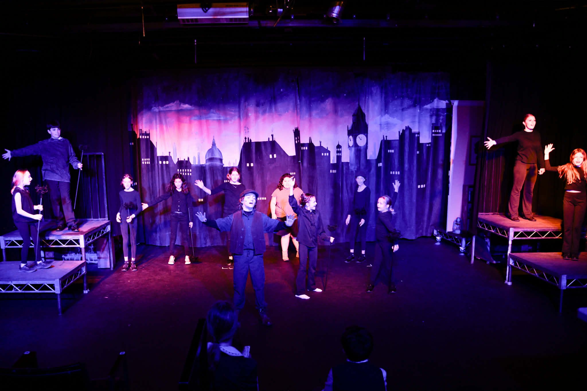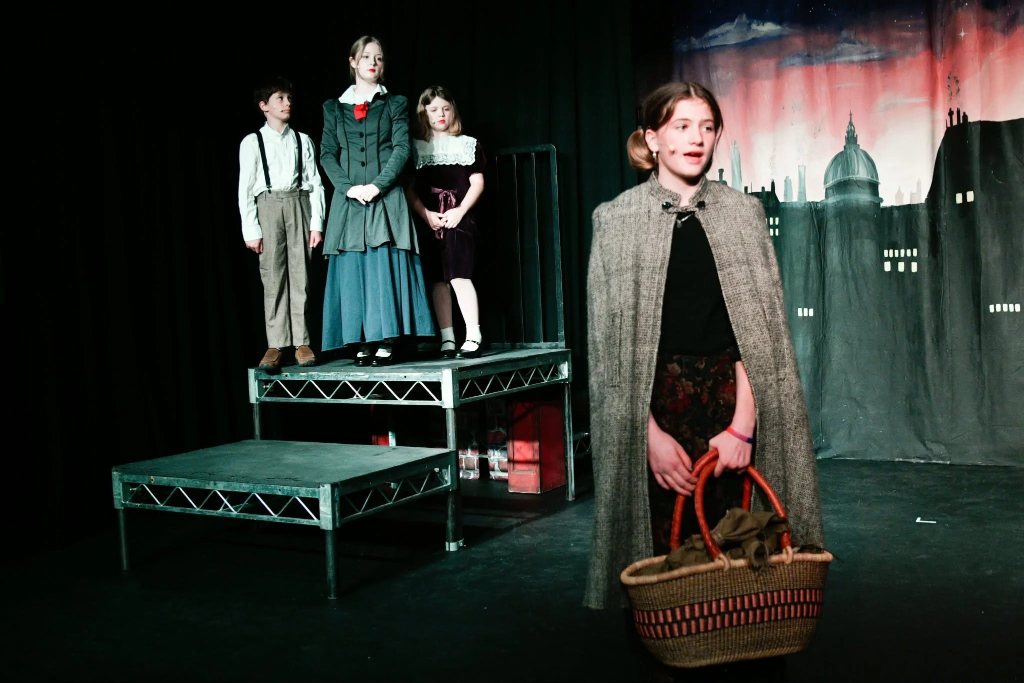 - The chimney sweeper number was one of the most entertaining moments of the show. The choreography was sharp, energetic, and clearly well-rehearsed. You could tell this was a scene the cast put a lot of time into, and it paid off. Each performer committed fully, creating a fun, lively sequence that kept the audience engaged from start to finish. It’s not always easy to get a large group moving in sync, but this group delivered. The lighting during this scene worked beautifully with the hand-painted backdrop, enhancing the mood and tying everything together visually. It created a moment that felt dynamic. A true standout that showcased the strength of the ensemble.